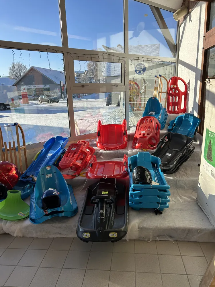 Zoomer 27-11-2025 Les luges viennent d arriver chez U EXPRESS ORCHAMPS VENNES Il y en aura pour toute la famille, même pour ceux qui freinent avec les pieds 😅😅